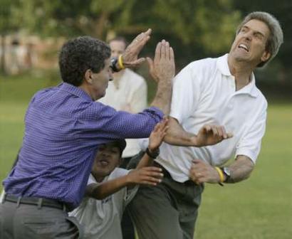 It has been pointed out to me that Kerry may actually be a Freemason, suffering from cranial-rectal impaction or he may simply be attempting to find his posterior without the aide of both hands, a map, or a compass.