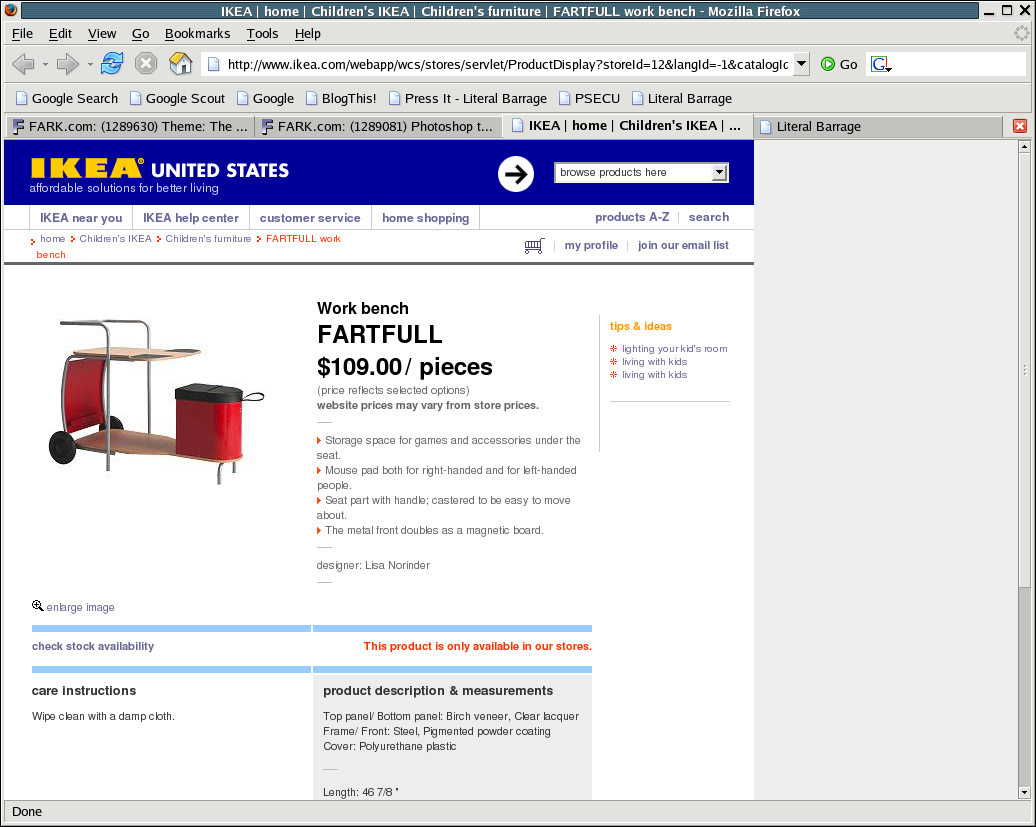 Since Ikea’s Fartfull product page apparently no longer exists (suggesting that someone pointed out the inappropriateness of the name to someone Higher Up and Rapid Executive Decisions Were Made, possibly with Swedish Precision), I’ve helpfully archived a screenshot for posterity’s sake: