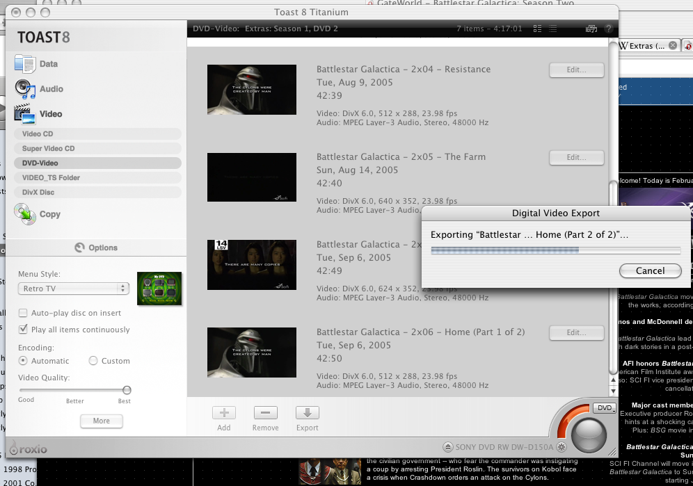 I have been taking full advantage of this ability, as I am sadly over a full season behind on my Battlestar Galactica and thus have been converting the unwatched DivX AVIs I have laying about into iPod-ready .m4v’s. I am then able to transfer them to my iPod and catch up on BSG at a rate of roughly two episodes per day. I should be just about caught up within 20 days or so, barring unforeseen interruptions.