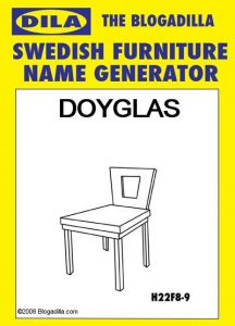 Useless Timewaster Of The DayDougAugust 20, 2008Humor1 Comment What’s your Swedish furniture name? Tags# IKEA Doug Husband & father with youngins; Presbyterian; Will devops for boardgames; Dadjoke Enthusiast; Longtime WordPress user; The failure mode of “clever” is... Articles: 2529 Previous Post A Musical Interlude Next Post Your Tax Dollars At Work: NASA Redefines "EPIC FAIL"
